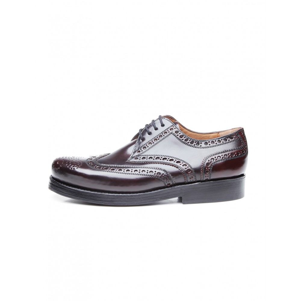 This model is a (full) brogue, with a wing cap and pinking and perforations.The original Budapest last is characterised by its high, slightly forward-tending tip.